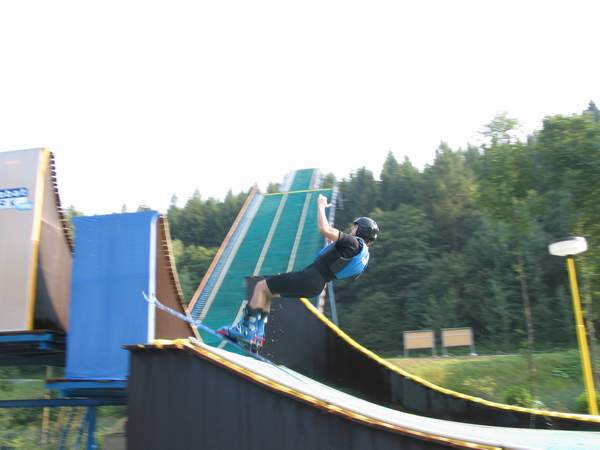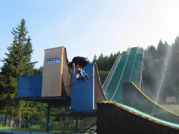 Najprv sme len opatrne skúšali, neskôr pridali nejaké to heli (vrut okolo osi) a odvážili sa aj na saltá. Ja som dal prvé dozadu a Mirec zas dopredu. Viac menej sme to celkom prežili aj keď sme sa poriadne oplieskali a