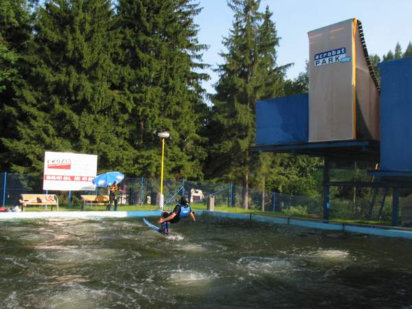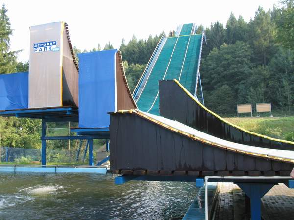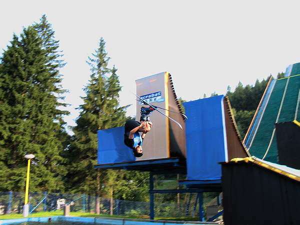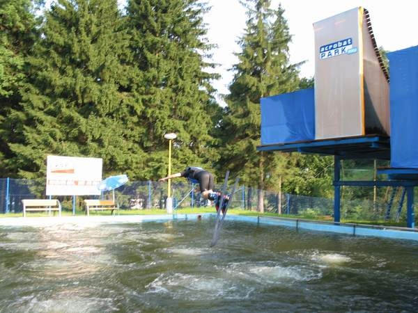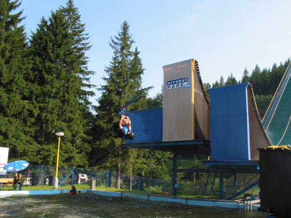 Ďalším bláznivým nápadom na ktorý sme prišli, bol nácvik skokov na big-airovom skoku do vody. Za týmto účelom sme sa ja (Peter) a Miro (Čimbora) vybrali 24.8. 2002