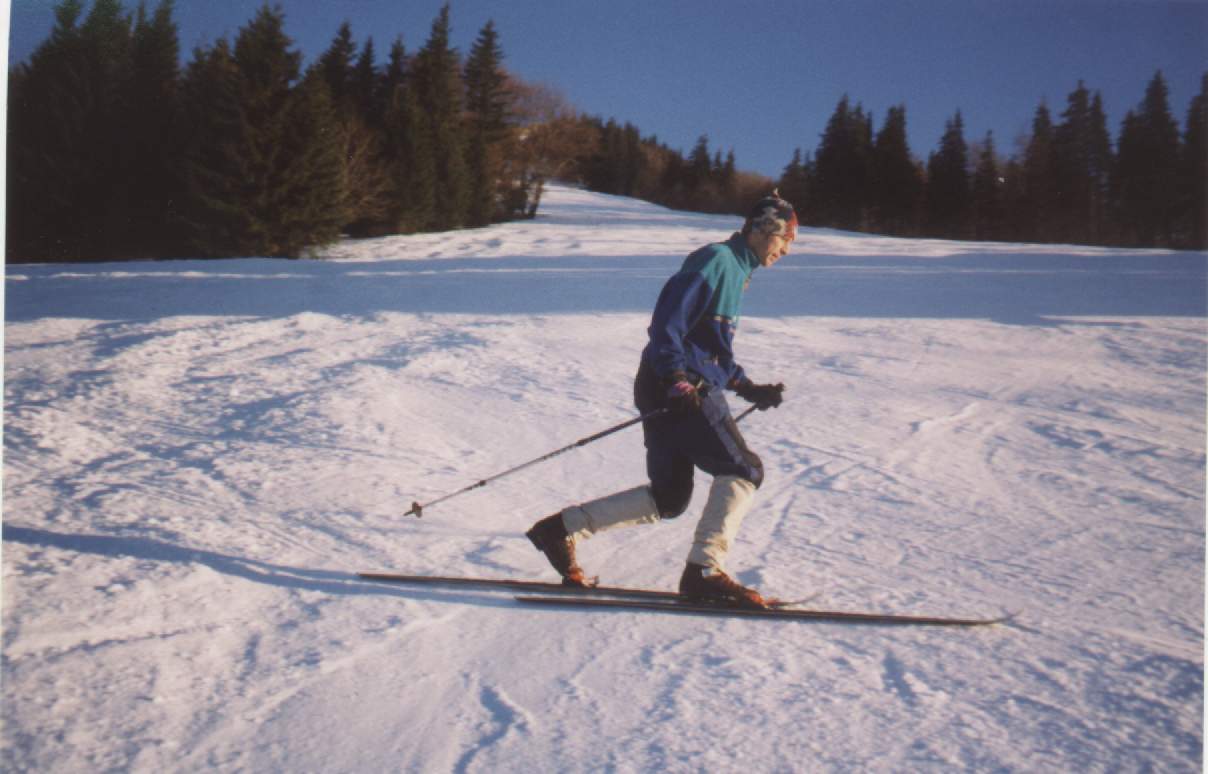 Obr. Evka na ŠachtičkáchNesnažte sa vyraziť na ťažšiu zjazdovku, aj keď ju poznáte. Stabilita v telemarku je podstatne iná ako pri štandartnom lyžovaní a mohlo by sa vám stať, že miesto, ktoré ste prešli sto krát vám pri požití telemarkovej výstroje spôsobí problémy. Pre začiatok je vhodný veľmi mierny svah, kde prídete na to "ako to funguje". Potom je už možné vyraziť na strmší svah, kde už nebudete bojovať o prežitie, ale elgantne zužitkujete drinu odvedenú na "somárskej lúke".
